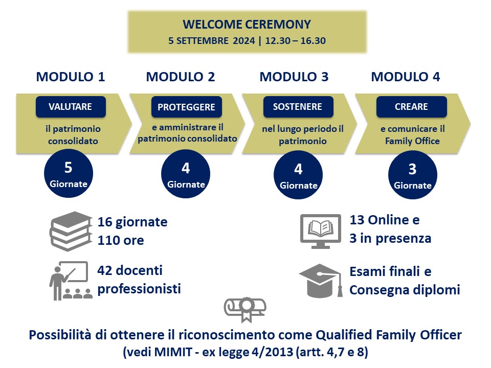 Il Master in Family Office è l’unico percorso in Italia ideato per trasferire le metodologie e le competenze di chi è chiamato alla gestione e al controllo di patrimoni rilevanti e/o multigenerazionali in grado di coniugare asset reali, finanziari e asset intangibili in un modello integrato e sostenibile. È rivolto a rappresentanti di famiglie, professionisti già attivi in Family Office o assimilabili a tali strutture, nonché a fiduciari e trustee. La modalità didattica consiste in un percorso formativo strutturato in quattro macro aree che hanno l’obiettivo di dotare i partecipanti di competenze integrate necessarie per guidare un patrimonio familiare lungo le diverse fasi: dalla valutazione del patrimonio consolidato, alla sua protezione, gestione e amministrazione, dalla sostenibilità nel tempo al passaggio alle generazioni a venire.